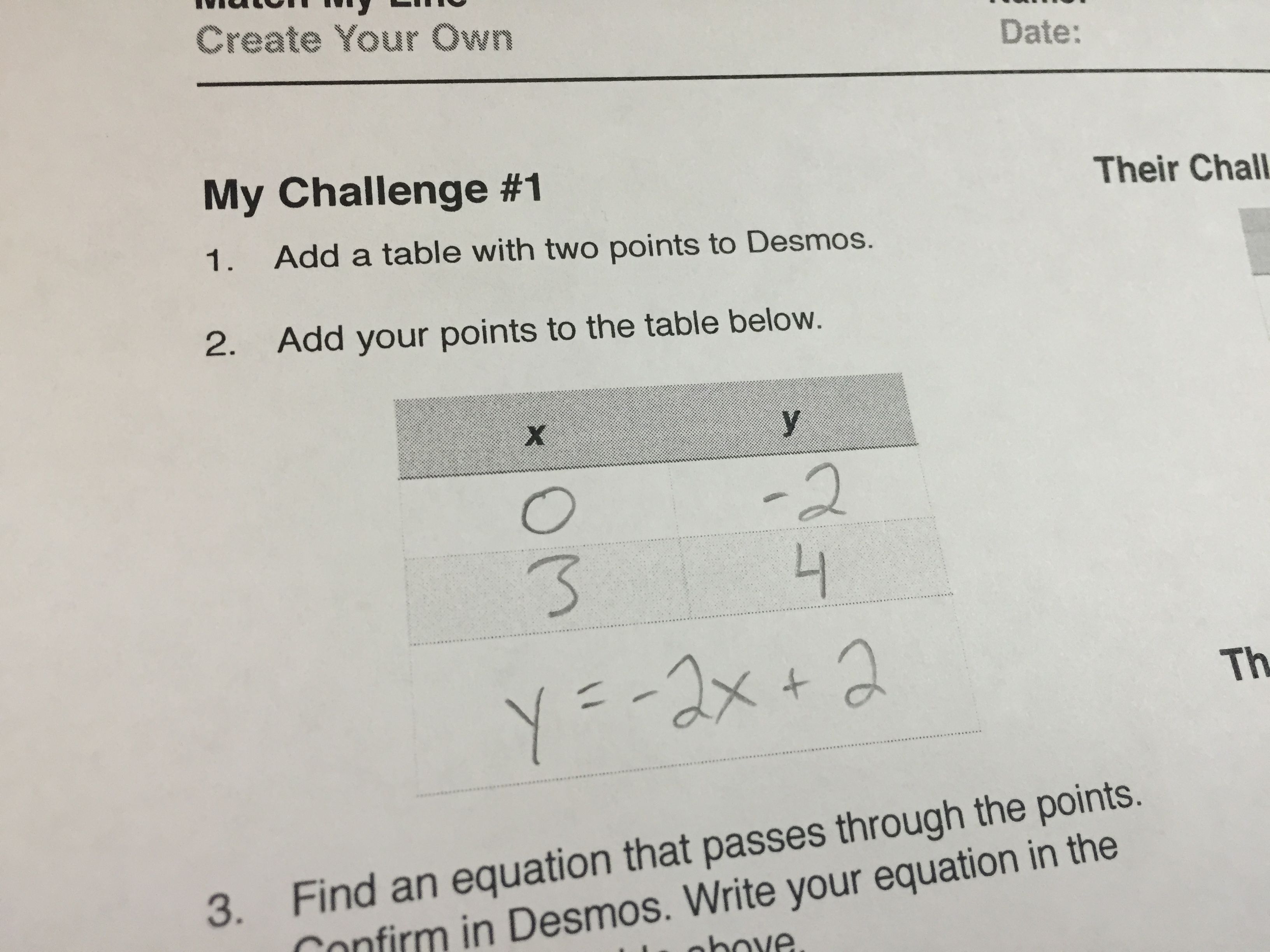 Step 4: Trade your points (but not equation) with a partner. Hunt for their equation, using a new Desmos graph to confirm. Record the points and equation in “Their Challenge #1.”
