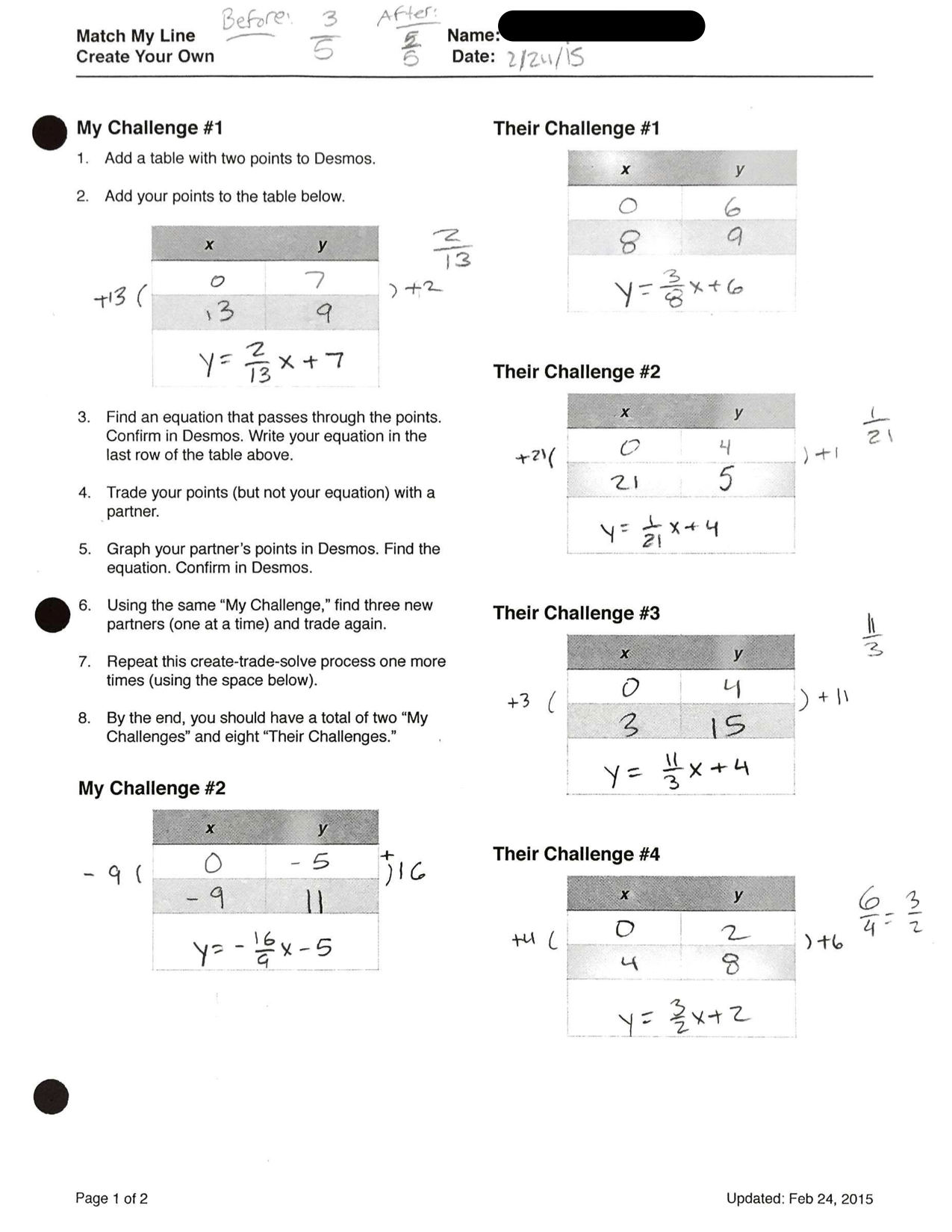 Step 6: Create a new equation, and run through four rounds of trading/graphing again, this time recording the results on the back (“Their Challenge #5-8”).