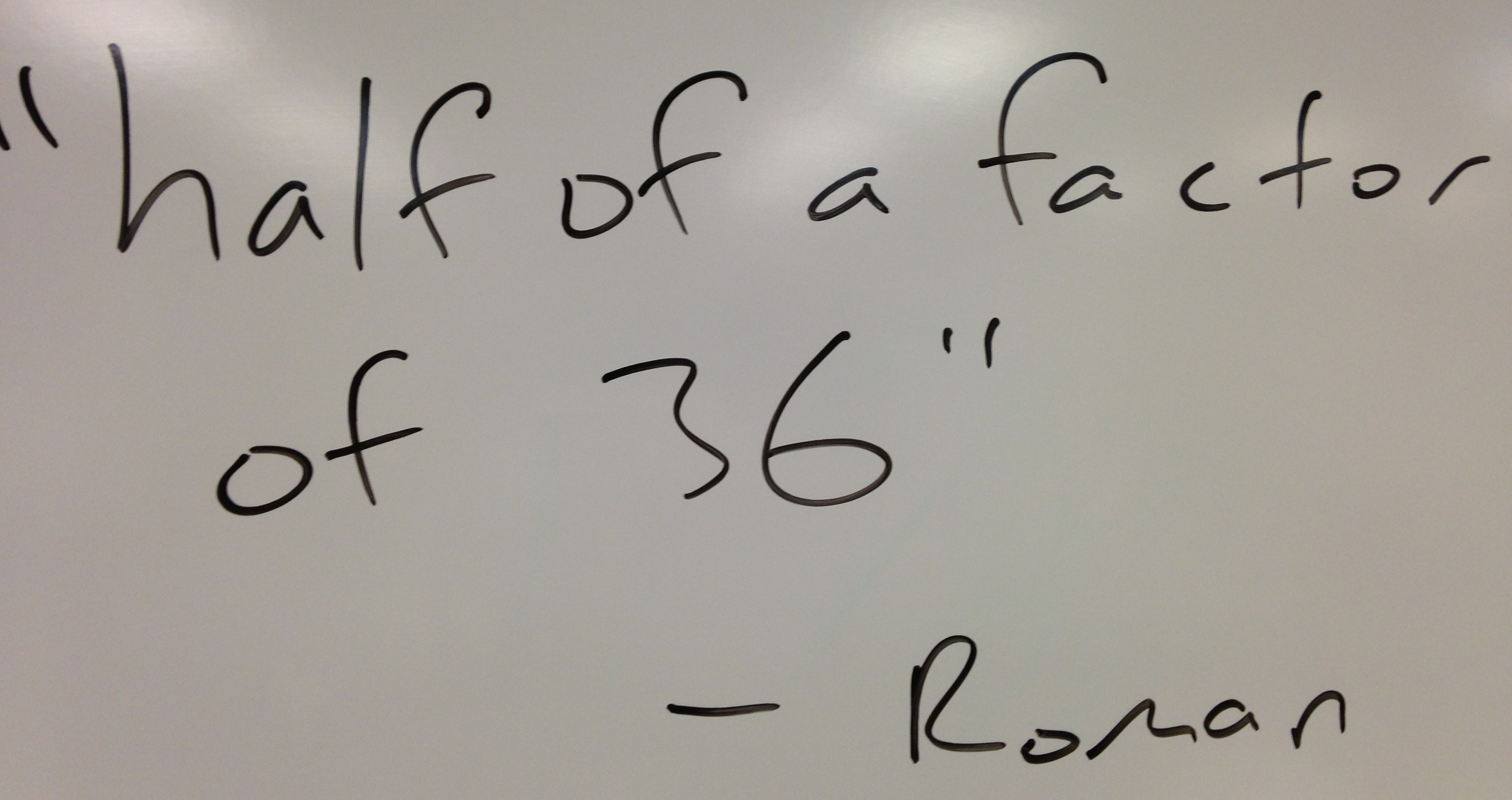 But my students didn’t have half a clue what “half a factor of…” would mean, and I was on the edge of my seat to see where they would take this. (Correction: I was standing. But I fully expect I was standing on the edge of wherever it was that I was standing.)