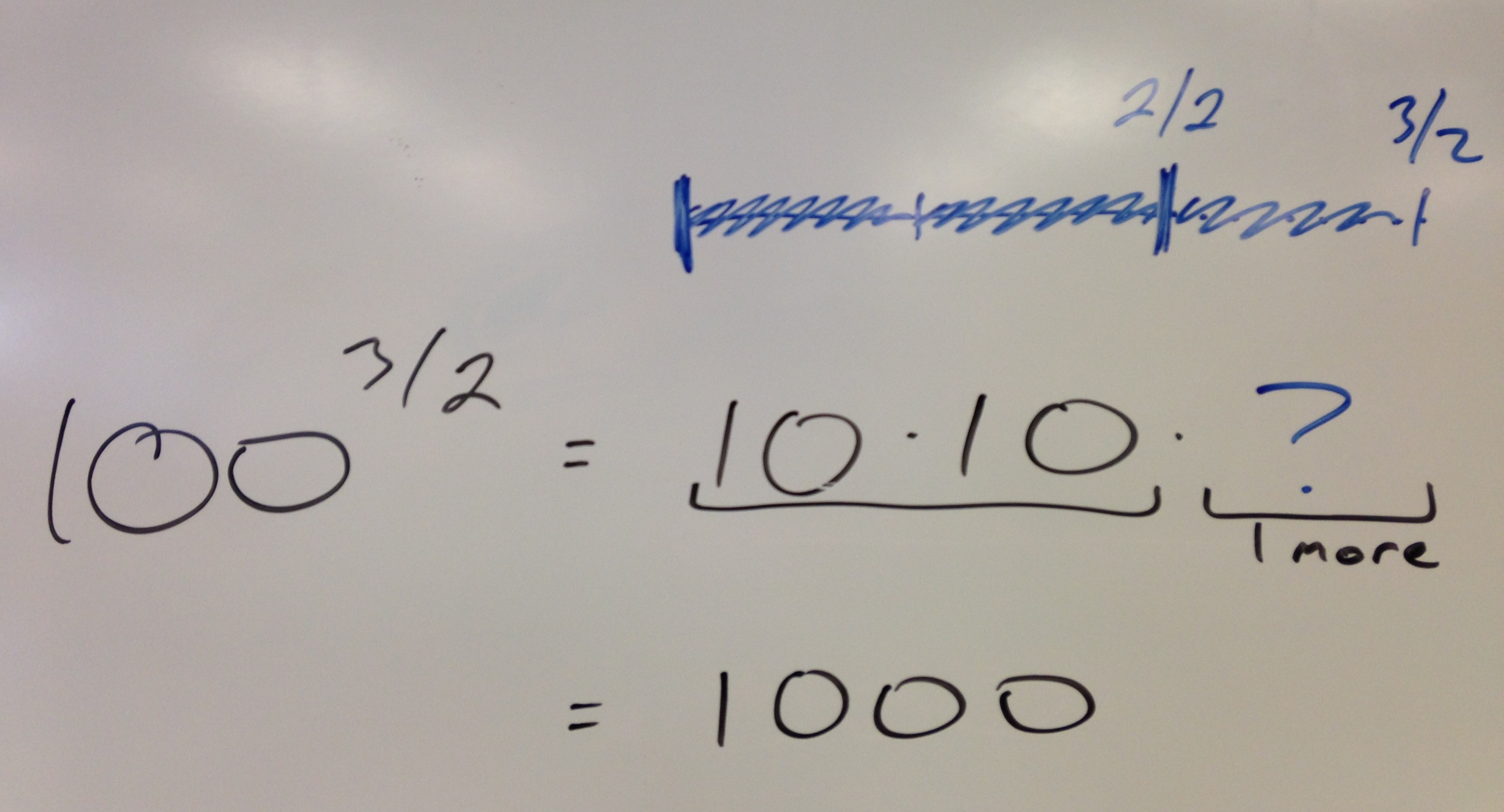 Well, several weeks ago in Algebra 1 (the above student’s class) we had our first discussion of rational exponents. As usual, I was trying to elicit from them the idea that “to the 1/2” can be thought of as “square root,” and so on.